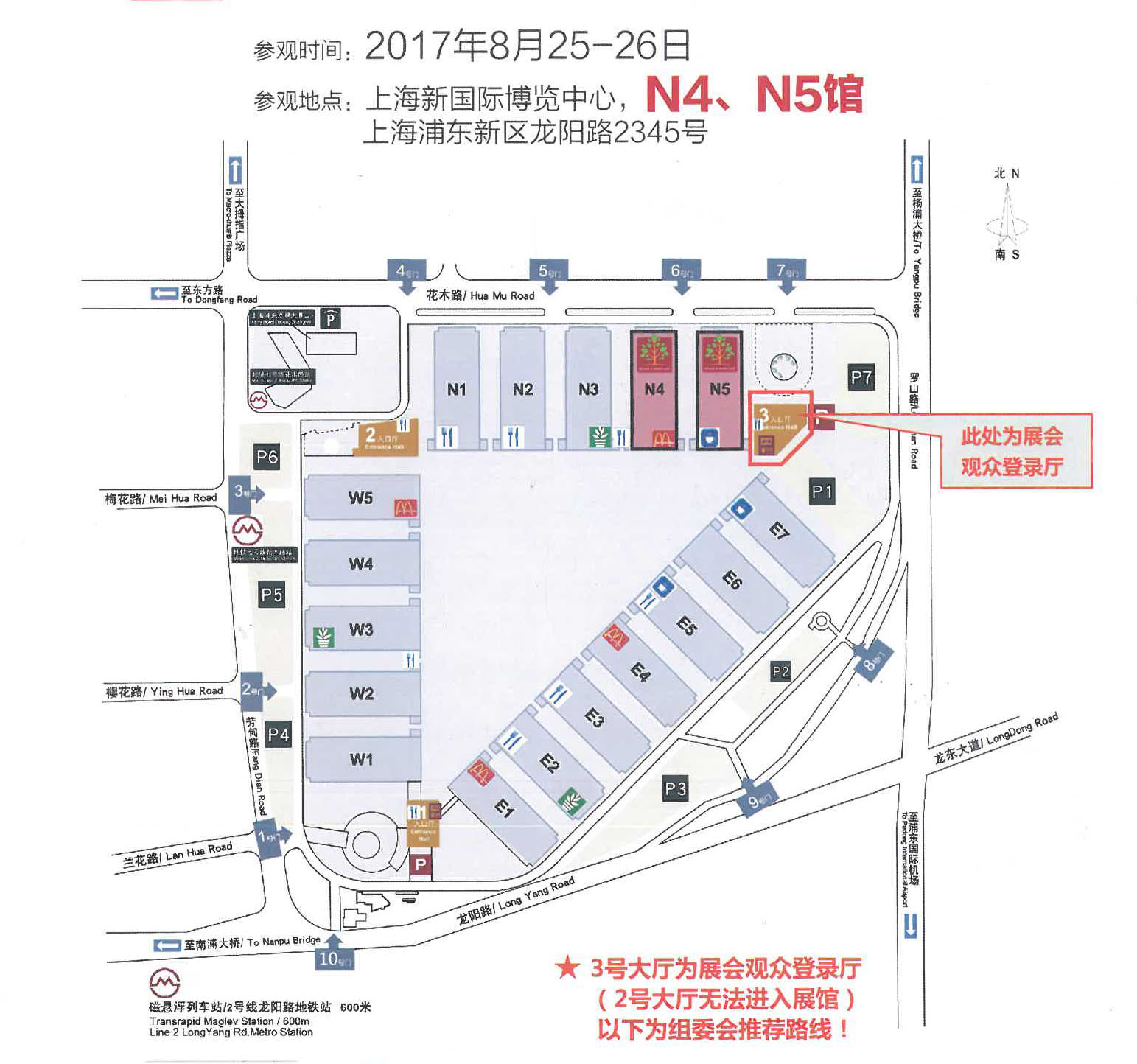 地鐵路線:地鐵7號線至龍陽路站下,搭乘康復展專用接駁車輛或步行至3號入口登錄大廳。