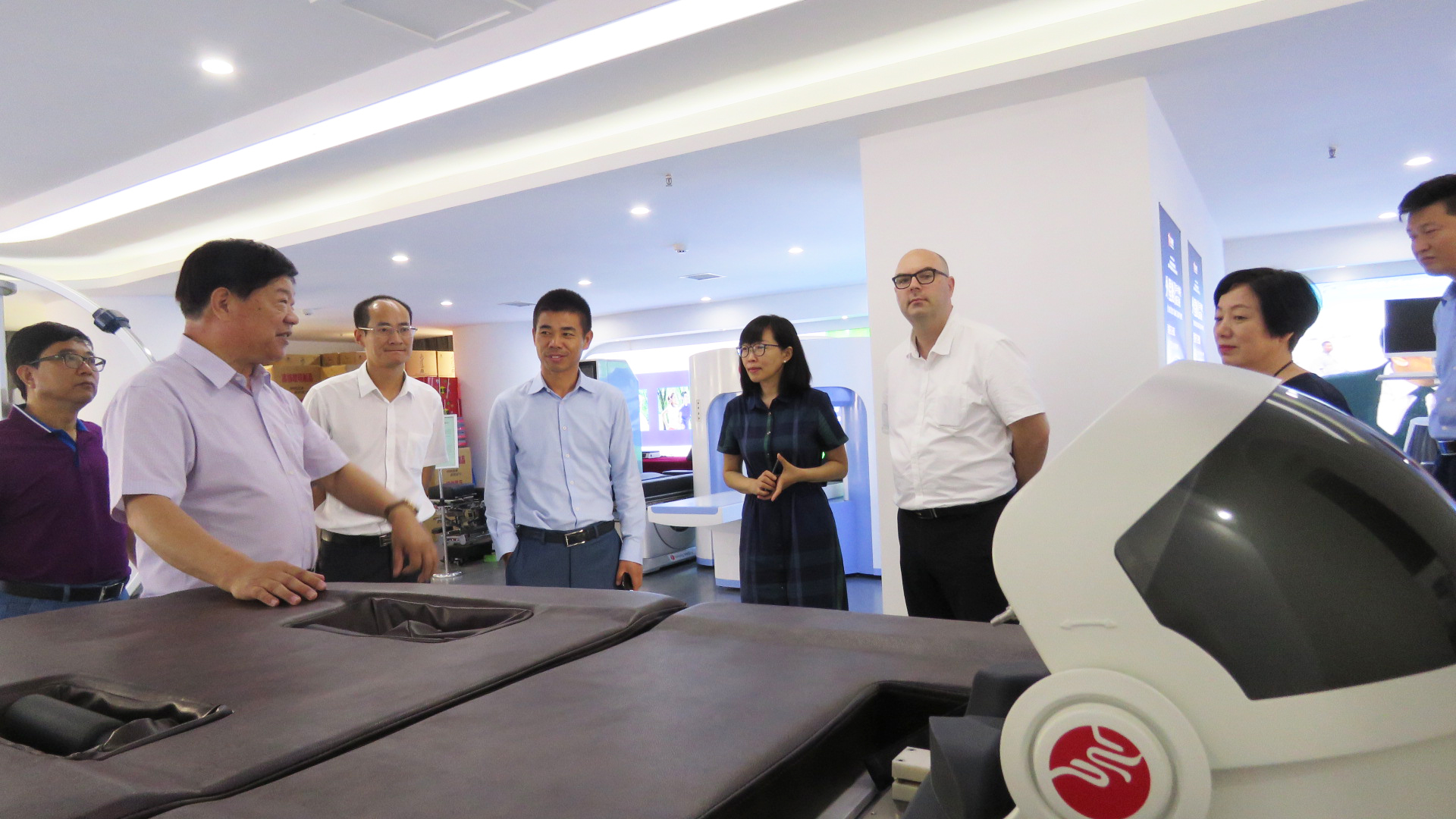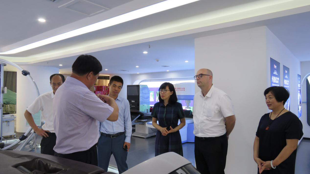 鄭州飛龍醫(yī)療設(shè)備有限公司董事長張新民帶領(lǐng)大家前往飛龍醫(yī)療產(chǎn)品展廳進行參觀,他向來賓詳細介紹了飛龍醫(yī)療的外星艙非手術(shù)脊柱減壓系統(tǒng)、外星艙頸椎定位周期牽引系統(tǒng)等高端康復設(shè)備,以及自主研發(fā)生產(chǎn)的艱辛歷程,促進了彼此的深入了解。