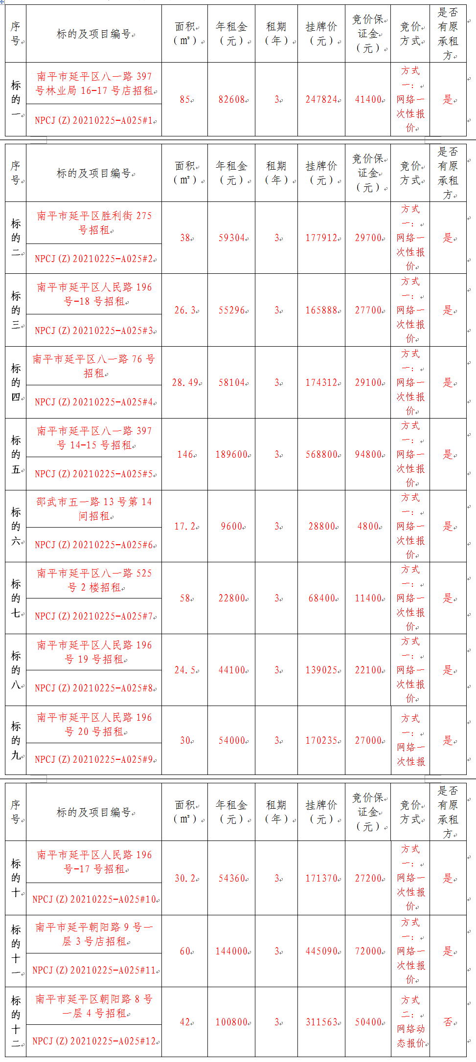 1.標(biāo)的分別位于南平市延平區(qū)八一路、勝利街、人民路、朝陽路、邵武市五一路,租金按月支付。租賃標(biāo)的一及標(biāo)的七無遞增;租賃標(biāo)的八至標(biāo)的標(biāo)的十的年租金自第二年起在上一年租金基礎(chǔ)上逐年遞增5%;租賃標(biāo)的十一至標(biāo)的十二自第二年起在上一年租金基礎(chǔ)上逐年遞增3%。 2.為便于競買人計(jì)算面積單價(jià),網(wǎng)絡(luò)競價(jià)以年租金底價(jià)進(jìn)行報(bào)價(jià),最終成交價(jià)以年租金的最高報(bào)價(jià)×租賃期限。 3.本次競價(jià)標(biāo)的一至標(biāo)的十一屬在同等條件下原承租方享有優(yōu)先承租權(quán)。 4.起租時(shí)間: 4.1若租賃標(biāo)的一至標(biāo)的二及標(biāo)的八的原承租人未報(bào)名參加競租或報(bào)名參加競租未取得標(biāo)的,原承租人應(yīng)于2021年3月31日前將承租房產(chǎn)退還出租方,若原承租人報(bào)名參加競租并取得標(biāo)的,起租時(shí)間自2021年4月1日起計(jì)算;新承租人起租時(shí)間自出租方通知接收房產(chǎn)之日起計(jì)算。 4.2若租賃標(biāo)的三至標(biāo)的六及標(biāo)的九至標(biāo)的十的原承租人未報(bào)名參加競租或報(bào)名參加競租未取得標(biāo)的,原承租人應(yīng)于2021年4月30日前將承租房產(chǎn)退還出租方,若原承租人報(bào)名參加競租并取得標(biāo)的,起租時(shí)間自2021年5月1日起計(jì)算;新承租人起租時(shí)間自出租方通知接收房產(chǎn)之日起計(jì)算。 4.3若租賃標(biāo)的七及標(biāo)的十一的原承租人未報(bào)名參加競租或報(bào)名參加競租未取得標(biāo)的,原承租人應(yīng)于競租會次日起7天內(nèi)將承租房產(chǎn)退還出租方,若原承租人報(bào)名參加競租并取得標(biāo)的,起租時(shí)間自成交公示期滿次日起計(jì)算;新承租人起租時(shí)間自出租方通知接收房產(chǎn)之日起計(jì)算。 4.4租賃標(biāo)的十二新承租人起租時(shí)間自成交公示期滿次日起計(jì)算。 5.因本次租賃標(biāo)的一至標(biāo)的十一的原承租方未予騰退,若本租賃房屋由原承租方外的第三人競得,自成交確認(rèn)起3個(gè)月內(nèi)出租方仍無法收回租賃房屋的,出租方與新承租方均有權(quán)解除合同,合同解除后,出租方無息退還新承租方合同履約保證金,出租方、組織方不再承擔(dān)其它法律責(zé)任。 6.具體事項(xiàng)以與出租方簽訂《房屋租賃合同》為準(zhǔn)。 |